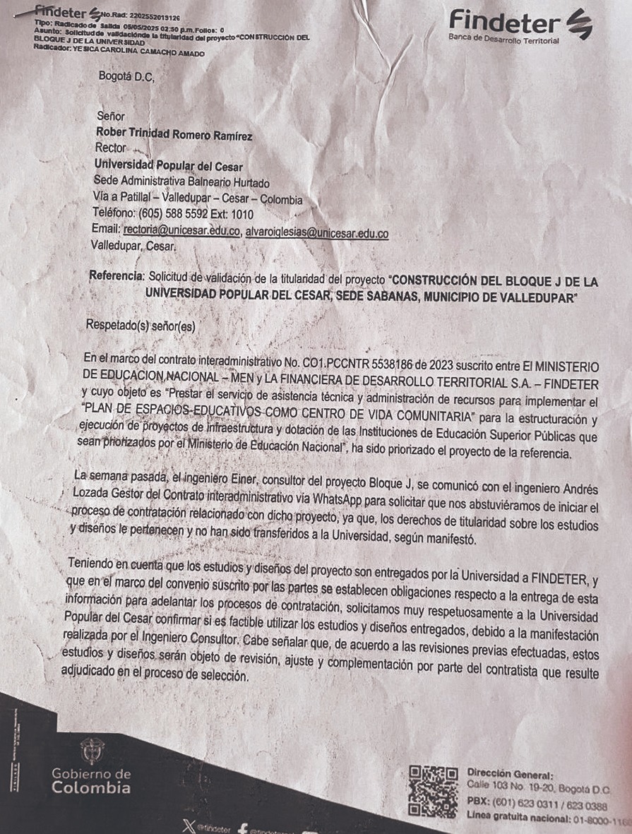 El Semanario La Calle publica la carta que Hernán Pardo Botero, gerente de Infraestructura de Findeter, le envía al rector Rober Romero, donde queda demostrado que la fuente que informó que sí hubo diseños y que sí se iban a subir, no le mintió a este semanario. “La semana pasada, el ingeniero Einer, consultor del proyecto del Bloque J, se comunicó con el ingeniero Andrés Lozada, gestor del contrato interadministrativo, vía WhastApp para solicitar que nos abstuviéramos de iniciar el proceso de contratación relacionado con dicho proyecto, ya que los derechos de titularidad sobre los estudios y diseños le pertenecen y no han sido transferidos a la universidad, según manifestó”, dice Pardo Botero en la misiva enviada al rector.