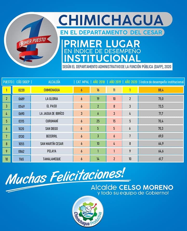 El pasado 28 de mayo, el Departamento Administrativo de la Función Pública revela índices de la buena gestión, avances y el cumplimiento de las metas trazadas por el gobierno “Chimichagua Productiva” donde el municipio obtuvo una puntuación de 88,4 que lo ubica por encima de grandes ciudades, incluyendo la capitales de departamentos; pasando, además, del puesto 17 a nivel departamental, que ocupó en el 2019, al número 1 y el número 11 a nivel nacional, entre 1.102 municipios.