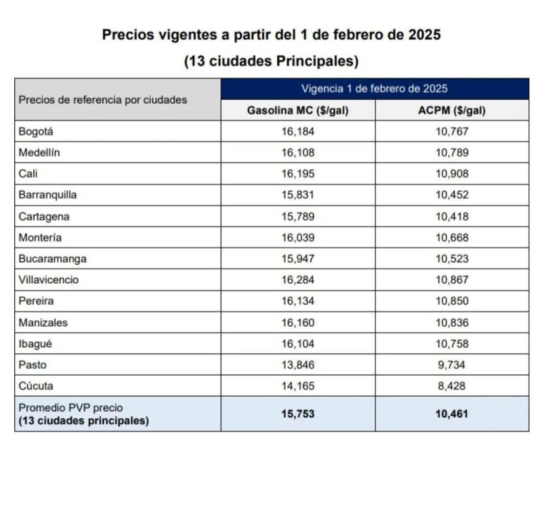 Entre las ciudades con los precios más altos, Villavicencio lidera con un costo de $16.284 por galón de gasolina, seguida de Cali, donde se fijó en $16.195, y Bogotá, con $16.184. En contraste, Pasto tiene el precio más bajo del país, con $13.846 por galón, seguida de Cúcuta ($14.165) y Cartagena ($15.789).