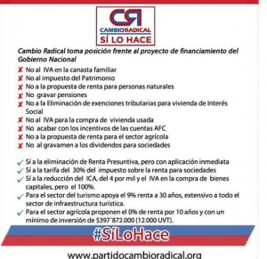 Dentro de los puntos que la bancada votará negativo, están el No al IVA en la canasta familiar, no al impuesto del Patrimonio, no gravar pensiones, no a la propuesta de renta para personas naturales, no al IVA para la compra de vivienda usada; entre otros. En total son nueve los puntos a los que los congresistas le dirán no.