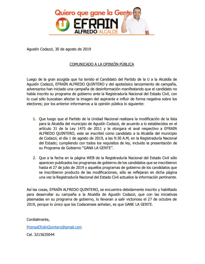 Luego que se dijera que el candidato a la alcaldía de Codazzi, Efraín Alfredo Quintero, presentaba problemas con la inscripción de su programa de gobierno ‘Gana la Gente’, en la Registraduría Nacional, este emitió un comunicado de prensa en el que aclara las razones por las que, en vez de su programa aparece el de su papá Efraín Quintero, quien inicialmente era el candidato.