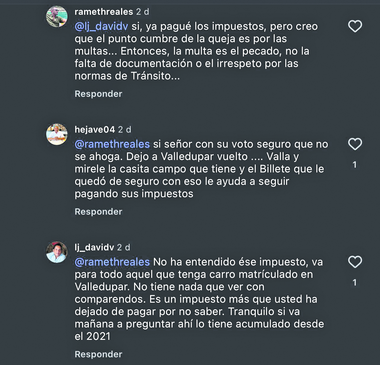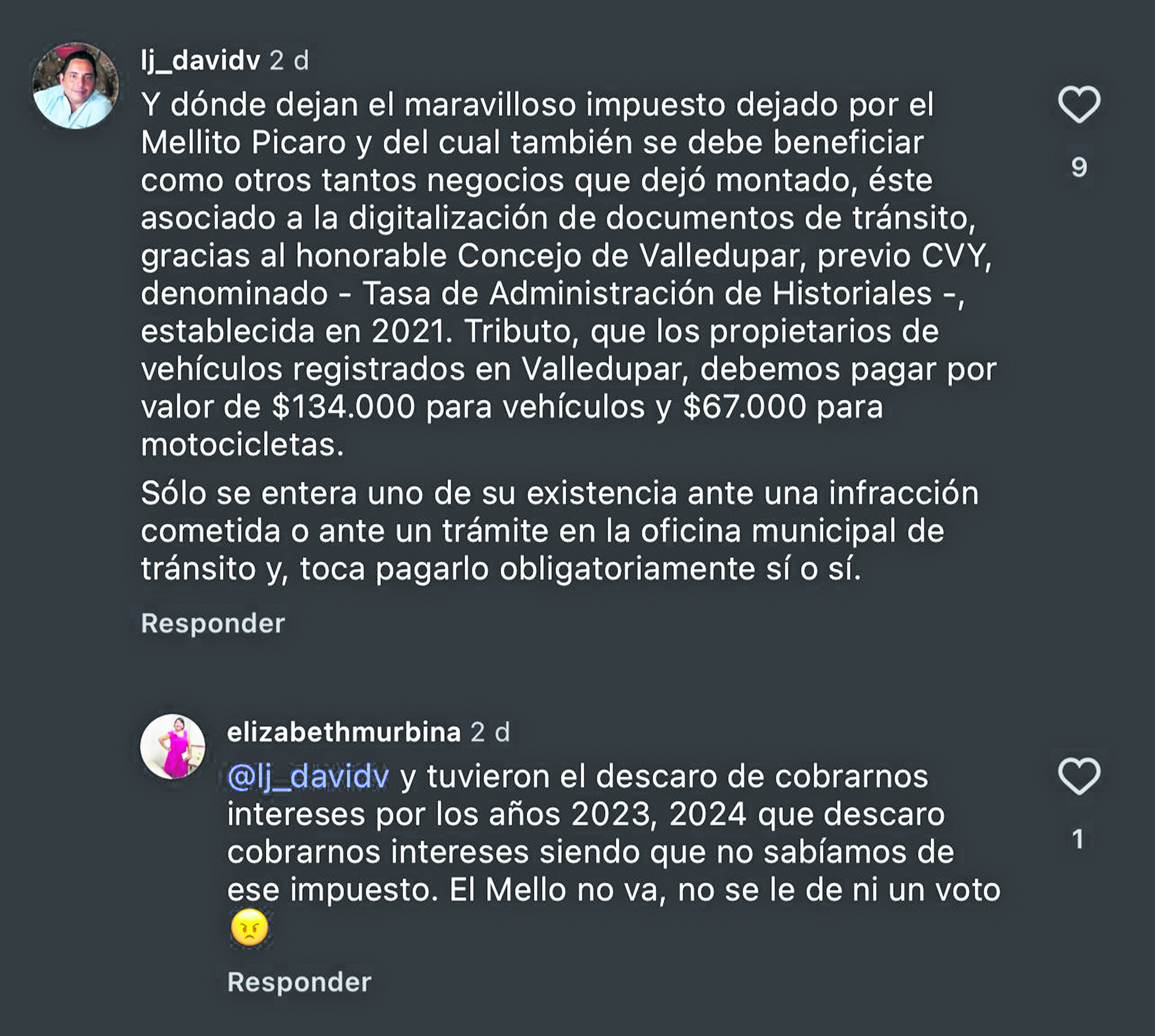 “Y dónde dejan el maravilloso impuesto dejado por el Mellito, y del cual se debe beneficiar como otros tantos negocios que dejó montado, este asociado a la digitalización de documentos de tránsito, gracias al honorable Concejo de Valledupar, previo CVY, denominado – Tasa de Administración de Historiales- establecida en el 2021”, precisó Leopoldo David, en las redes del Semanario La Calle.