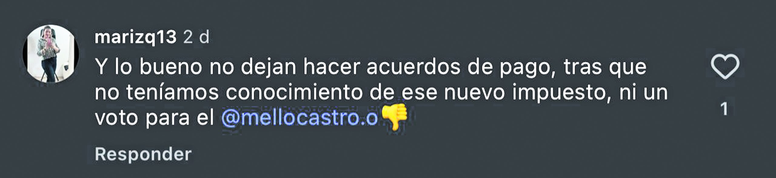 “Y lo bueno es que no dejan hacer acuerdos de pago, tras que no teníamos conocimiento de ese nuevo impuesto, ni un voto para el Mello Castro”, escribió otra usuaria identificada como Mary.