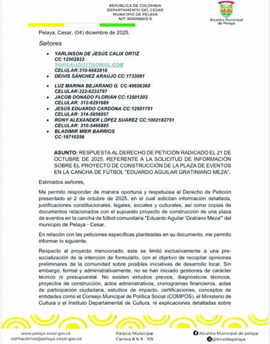 La controversia por la posible construcción de una plaza comercial impulsada por la administración y conocida  como la “plaza cívica cultural” en la cancha municipal de fútbol de Pelaya, ha desatado una fuerte reacción ciudadana. El escenario deportivo, considerado patrimonio del municipio y con cerca de 60 años de existencia, es hoy el centro de una movilización comunitaria que busca frenar lo que califican como una “destrucción injustificada”.
