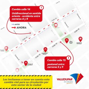 Debido a las intervenciones que se adelantan en el centro histórico de Valledupar, la secretaría de Tránsito y Transporte Municipal, estableció el cambio en el sentido del flujo vehicular de la calle 14, quedando en circulación unidireccional en sentido oriente – occidente entre las carreras 4 y 9.
