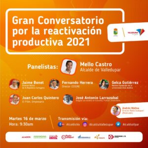 La administración ‘Valledupar en Orden’, invita a la comunidad para que se haga partícipe del “Gran conversatorio por la reactivación productiva 2021”, que se transmitirá online por las cuentas oficiales de la alcaldía este martes 16 de marzo a las 9:30 de la mañana.