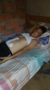 Estado en sus vivienda, familiares indicaron que Jesús David, se le empieza a inflamar el abdomen, agregando que por la herida le salía materia fecal, por lo que fue internado nuevamente en el Hospital Rosario Pumarejo de López.
