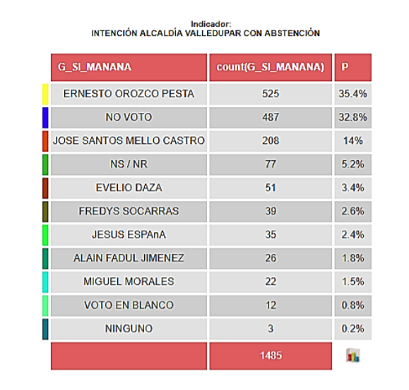 De acuerdo con la firma Ágora, incluyendo la abstención, a la pregunta de por quién votará en las próximas elecciones, el 35.4.% de los encuestados indicó que lo haría por Ernesto Orozco. Por su parte, el 32.8.% señaló que no votaría en las elecciones; en siguiente lugar, el 14% de los consultados expresó que lo haría por el Mello Castro; el 5.2% se mostró indeciso y no respondió la pregunta. El 3.4% dijo que votaría por el doctor Evelio Daza Daza, El 2.6% por Fredy Socarrás; el 2.4% por Jesús España; el 1.8% por el médico Alain Jiménez Fadul, el 1.5% por el artista Miguel Morales, el 0.8% votaría en blanco.