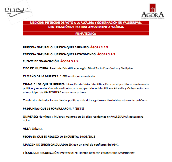 Nuevamente la firma encuestadora Ágora le tomó la temperatura a la contienda política por la alcaldía de la capital cesarense. Su más reciente medición de intención de voto a la alcaldía de Valledupar es la sexta en serie realizada hasta la fecha, según informa la propia firma.