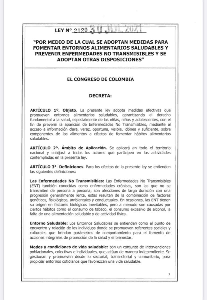 “Adopta medidas efectivas que promueven entornos alimentarios saludables, garantizando el derecho fundamental a la salud, especialmente de las niñas, niños y adolescentes, con el fin de prevenir la aparición de Enfermedades No Transmisibles, mediante el acceso a información clara, veraz, oportuna, visible, idónea y suficiente, sobre componentes de los alimentos a efectos de fomentar hábitos alimentarios saludables”, se lee en el documento.