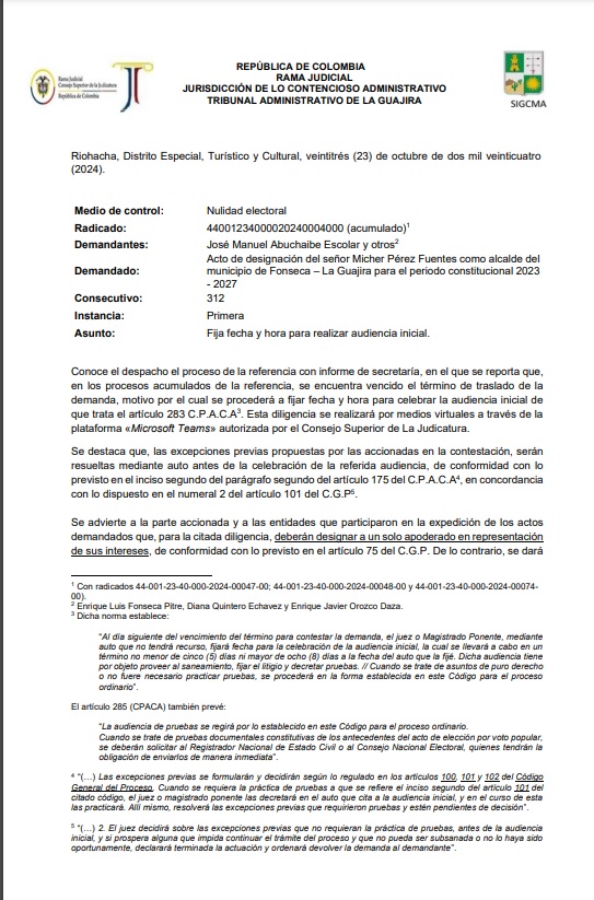 “Fijar el día siete (7) de noviembre de dos mil veinticuatro (2024), a las diez de la mañana (10:00 a.m.), como fecha y hora para llevar a cabo la audiencia inicial dentro del proceso de la referencia, la cual se sujetará a lo establecido en los artículos 180 y 203 del C.P.A.C.A. Esta diligencia se realizará por medios virtuales a través de la plataforma «Microsoft Teams»”, resolvió la Jurisdicción de lo Contencioso Administrativo Tribunal Administrativo de La Guajira en la relación con la demanda del Acto de designación de Micher Pérez Fuentes como alcalde del municipio de Fonseca – La Guajira para el periodo constitucional 2023 – 2027.