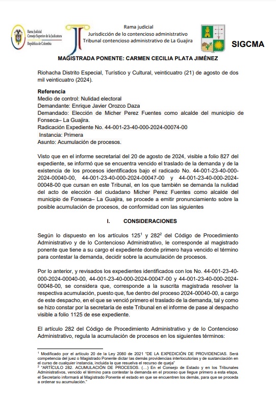 Hay que recordar que, ya el 21 de agosto de 2024, en otro Auto, el mismo Tribunal resolvió “Declarar la acumulación de los procesos electorales radicados con los números radicados 44-001-23-40-000-2024-00040-00, 44-001-23-40-000-2024- 00047-00, 44-001-23-40-000-2024-00048-00 y 44-001-23-40-000-2024-00074-00, promovidos por José Manuel Abuchaibe Escobar, Enrique Luis Fonseca Pitre, Diana Quintero Echávez y Enrique Javier Orozco Daza, respectivamente”.
