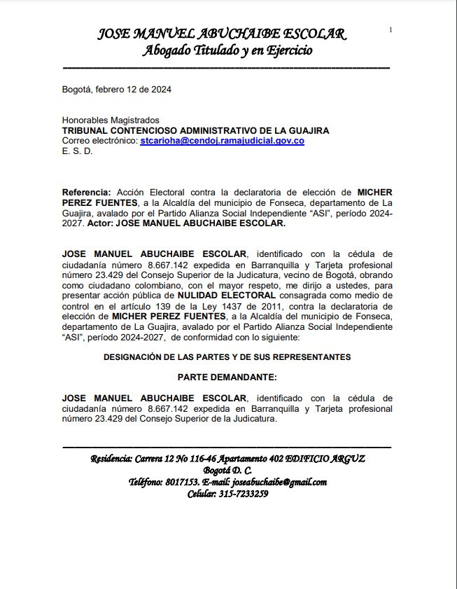 Ya el 12 de febrero de 2024, el prestigioso abogado guajiro José Manuel Abuchaibe Escolar, en un documento de 966 páginas, se dirigió a los magistrados Tribunal Contencioso Administrativo de La Guajira, “para presentar acción pública de Nulidad Electoral consagrada como medio de control en el artículo 139 de la Ley 1437 de 2011, contra la declaratoria de elección de Micher Perez Fuentes, a la Alcaldía del municipio de Fonseca, departamento de La Guajira, avalado por el Partido Alianza Social Independiente “ASI”, período 2024-2027”.