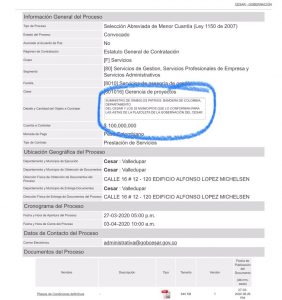 A través de mensajes en Twitter, usuarios revelaron un documento que corresponde a un proceso contractual o licitación efectuada por la gobernación del Cesar para la compra de las banderas de los 25 municipios del Cesar que reposan en la plazoleta María Concepción Loperena, y cuyo valor es de 100 millones de pesos. El resumen de la licitación está en el SECOP con la resolución número 001747 a finales del mes de marzo. Ciudadanos mostraron su indignación frente a lo que consideran una exuberante cantidad de dinero usada, sobretodo en esta época de emergencia sanitaria que vive el país y el departamento con la llegada del Covid-19.