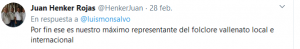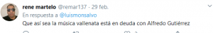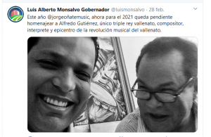 “Este año Jorge Oñate, ahora para el 2021 queda pendiente homenajear a Alfredo Gutiérrez, único triple rey vallenato, compositor, interprete y epicentro de la revolución musical del vallenato”, tweet que en el que no se hicieron esperar los comentarios.