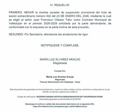 Junto con la demanda de nulidad, el actor solicitó la suspensión provisional del acto de elección mientras se define el fondo del asunto, con fundamento en los artículos 229 y 231 del CPACA. Argumentó que mantener a Villazón Tafur en el cargo mientras el proceso avanza resulta más gravoso para el interés público que suspenderlo provisionalmente, pues su permanencia en ejercicio desdibujaría la transparencia y objetividad del proceso de elección. Sin embargo, mediante auto de este 26 de marzo de 2026, el Tribunal Administrativo del Cesar negó la medida cautelar solicitada.
