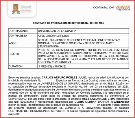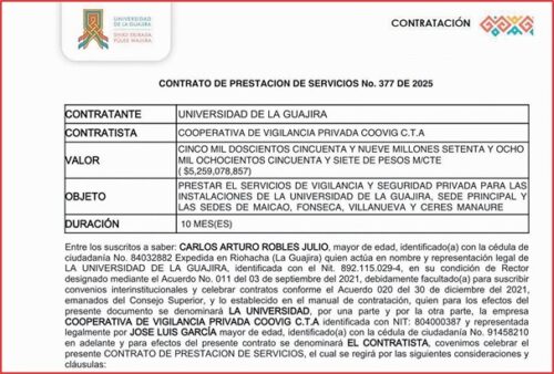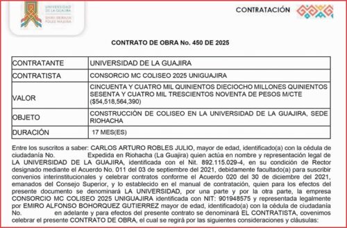 La Calle sólo ha mencionado los que tienen que ver con la constatación de personal, pero también han habido contratos para otros menesteres, como el de más de 54 mil millones de pesos para la ‘construcción de coliseo en la Universidad de La Guajira, sede Riohacha’.