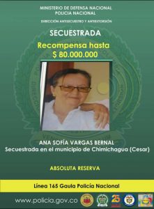 A pesar de que en días pasados, las autoridades en el departamento del Cesar ofrecieron una recompensa de hasta 80 millones de pesos, a quien diera información que pudiera dar con el paradero de Ana Sofía Vargas Bernal, la mujer de 70 años que fue secuestrada cuando llegaba a su finca ubicada en zona rural del municipio de Chimichagua, ha pasado una semana desde su desaparición y aún no se tiene noticia sobre ella, ni sus captores.