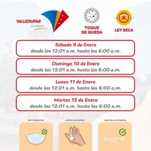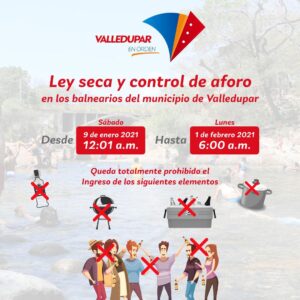 También se exceptuará, control de aforo en los balnearios del municipio de Valledupar y ley seca, que regirá a partir del mismo sábado 9 de enero, desde las doce y un minuto de la media noche (12:01 AM), hasta el lunes 1 de febrero a las seis de la mañana (6:00 AM), por lo tanto, queda prohibido el expendio e ingreso de bebidas alcohólicas, calderos, asaderos, termos, cavas, así estipuló la alcaldía en el Decreto N° 000009.