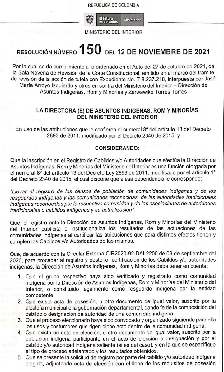 Desde el pasado 3 de noviembre tenían un plazo no mayor a 15 días “como tres cabildos gobernadores a Danilo Villafaña Torres en el Resguardo del Magdalena-Guajira, a Rogelio Torres Torres en el Resguardo de Sierra Nevada y a Iván de Jesús Torres Torres en el Resguardo de Businchama” para la respectiva aprobación y posesión. Así las cosas, estos tres facultados ejercerán la representación legal de cada resguardo.