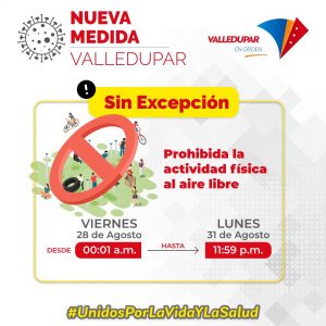 Una vez más las medidas tomadas por la administración municipal en Valledupar para tratar de detener el aumento de casos de Covid-19 en la ciudad genera voces a favor y en contra, puesto que en redes sociales ya hay voces que aseguran que es contradictorio que la Alcaldía decida prohibir durante todo el fin de semana la actividad física al aire libre en la ciudad – inicia el 28 de agosto hasta la madrugada del lunes 31 agosto-, medida que comenzará a regir desde el viernes 28 de agosto a las 12:00 a.m. e irá hasta lunes 31 de agosto a las 11:59 p.m.