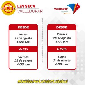 De otro lado, la ley seca se implementará desde hoy 27 de agosto a las 6 pm en franja horaria hasta las 4am del viernes y desde el viernes a las 6pm hasta el lunes a las 4am.
