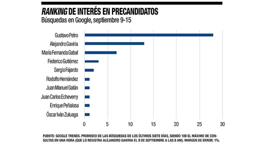 Gustavo Petro y Alejandro Gaviria son los precandidatos que despiertan mayor interés, si se juzga por las búsquedas en Google en la última semana (septiembre 9 a 15). Las búsquedas en Google no son un indicador de intención de voto, y por consiguiente no sustituyen las encuestas electorales. Pero son muy útiles para comparar el interés que despiertan los distintos candidatos.