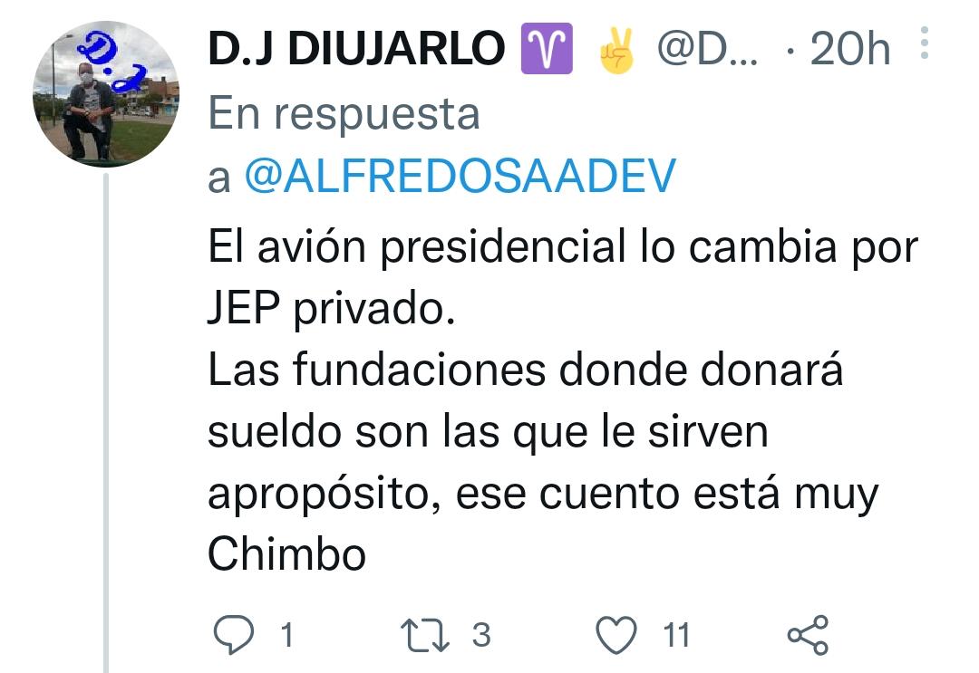 “Anoche hablé con parte de mi equipo en santa Marta, la decisión fue unanime: si soy presidente de la República vendere el avión presidencial. Los funcionarios de alto mando costearan la mitad de sus viáticos y donaré mi sueldo a 10 fundaciones que eduquen con valores niños”, los usuarios de Twitter lo señalan de populista y de no hacer más que propaganda politica, quien pensaría repetir la estrategia del mandatario mexicano, Andrés Manuel López Obrador (AMLO) cuando no entregó buenas cuentas en su paso por gerencia del Área Metropolitana de Valledupar.
